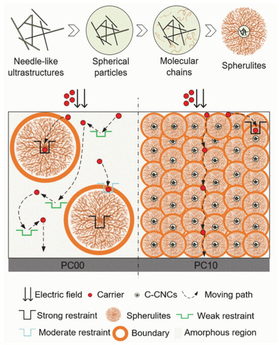 Schematic diagram of carrier transport in PC00 and PC10, the content of PC00 doped with C-CNCs is 0%, the content of PC10 doped with C-CNCs is 0.001% [49]. Copyright 2021, IEEE Transactions on Dielectrics and Electrical Insulation.