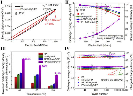 High-temperature energy storage performance of PP and PP nanocomposites. APTES-MgO is the amino-functionalized MgO nanoparticles, un-MgO is the MgO nanoparticles. (I) Polarization curves of pure PP and PP-mah-MgO/PP at 400 MV m−1 at 120; (II) charge/discharge efficiency and discharge energy density at 120 °C; (III) maximum energy storage density achieved at more than 90% charge/discharge efficiency measured at 80 °C and 120 °C; (IV) cyclic charge/discharge performance at 200 MV m−1 and 120 °C [62]. Copyright 2020, Energy Storage Materials.