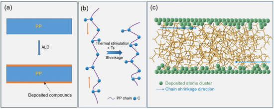 Experimental principle and microstructure characterization. (a) Schematic diagram of ALD deposition. (b) Schematic of molecular chains shrinking from thermal stimulation. (c) Schematic of the ALD inorganic layer anchoring the chain from moving [66]. Copyright 2021, Nano Express.