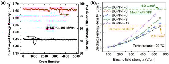 (a) Discharge energy density and energy storage efficiency of Al2O3/BOPP/Al2O3 thin films at 200 MV m−1 at 125 °C vs. number of cycles [70]. Copyright 2022, ACS Applied Energy Materials. (b) Modified BOPP electric field versus energy storage density. (The number represents the pressure spray treatment time, and the unit is s) [65] Copyright 2024, ACS Applied Polymer Materials.