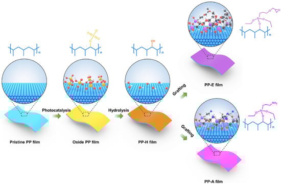 Chemical modification is more reliable, durable, and convenient than physical coating. The process of aging in BOPP can be effectively suppressed by surface phosphorylation. This is due to the generation of more stable carboxylic acids on the surface of BOPP under the action of electrothermal heat. This can effectively reduce the decomposition rate of the BOPP chain segments. The dielectric stability of BOPP at high temperatures is thus ensured [72]. E-beam irradiation technology improves the structure of polymers. It changes the polarity and defects on the surface, and the radiation can also be transmitted to the interior of the polymer, exerting a certain degree of influence on the polymer’s overall structure, crystalline shape, and so on [73,74]. Generally speaking, due to the action of radiation, the internal molecular chains become fractured, crosslinked, oxidized, etc., so the original long straight chain structure of PP is transformed into a star-shaped long-chain branched structure; at the same time, the electron beam can improve the polarity of the PP film, due to the radiation generating free radicals that react with oxygen to produce hydroxyl, carbonyl, and other polar groups, as well as the production of a number of chemical defects in the electron traps, which enhance the electron trapping, inhibiting charge transfer. These phenomena lead to the relative dielectric permittivity of the film, which results in a number of defects. These enhance the relative dielectric constant (3.98) and electrical breakdown strength (430 MV m−1) of the films. In addition, due to these improved properties, the energy storage density was enhanced to 279% of that of PP, at 3.6 J cm−3 [75]. The film modified through electron beam irradiation still had charge/discharge efficiency over 95%. The surface was hydroxylated by the UV radiation technique and then grafted with the silane coupling agent KH550 or KH560 to obtain the surface amino-modified PP and epoxy-modified PP. The modification process is shown in Figure 8. The modified PP had an enhanced dielectric constant due to the introduction of polar functional groups to enhance the dipole migration and polarization strength. Also, the breakdown strength at 120 °C was increased from 522.3 MV m−1 to 643.1 MV m−1,and the energy storage density was enhanced by 97.4% to 3.08 J cm−3 [76]. This was mainly due to the higher deep trap density and energy levels of the modified PP. These deep trap layers can trap more carriers from the electrodes, thus suppressing carrier migration within the dielectric, improving the breakdown strength.