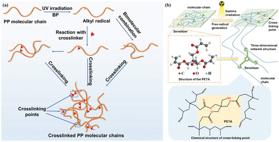 (a) Schematic representation of UV-initiated crosslinking reaction of PP molecular chains [28]. Copyright 2024, IEEE Transactions on Dielectrics and Electrical Insulation. (b) Schematic representation of PP crosslinking under γ-ray irradiation [81]. Copyright 2024, IEEE Transactions on Dielectrics and Electrical Insulation.