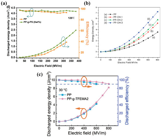 The main chain of PP is composed entirely of a carbon–carbon structure without any polar groups, which makes its dielectric constant low, seriously limiting improvements in the energy storage density of BOPP and the ability to meet the needs of modern electrical equipment [35,96]. Styrene (PS) has a certain degree of rigidity due to its own benzene ring structure; grafting it to PP is conducive to the formation of more nucleation sites, and the formation of more interfacial regions increases the interfacial polarization and can also introduce deeper traps to capture more carriers, reducing carrier mobility [97,98]. Furthermore, electron beam radiation grafting has been shown to be an effective method for preventing the entry of impurities without the need for additional additives. Concurrently, the grafting side of the electron beam radiation can introduce greater numbers of oxygen-containing functional groups, thereby increasing the polarity of the PP. In addition, the free radicals generated can form new traps to capture more carriers. The grafted film has an energy storage density of up to 5.43 J cm−3 at room temperature, and even at 110 °C, it is maintained at 3.44 J cm−3, compared to that of the pure PP of only 1.78 J cm−3, as shown in Figure 11a. This is attributed to the deeper trap energy level and higher trap density of the grafted PP [99]. Hydroxyl(-OH) is the most common polar group; grafting it to PP results in a more favorable enhancement of the energy storage density. The energy density of 7.42 J cm−3 at a field strength of 600 MV m−1 is more than twice that of unhydroxylated BOPP, as shown in Figure 11b below [100]. Trifluoroethyl fluoromethacrylate (TFEMA) with strong polarity was grafted onto PP, and it enhanced the latter’s breakdown strength to 865 MV m−1 while maintaining an energy density of 8.2 J cm−3 and charging and discharging efficiencies of more than 90%; the energy density is shown in Figure 11c [101]. This may be due to the fact that the graft-modified PP induces the generation of an α-crystalline type with smaller and denser grains and higher crystallinity, and also because the higher crystallinity enhances the mechanical properties, according to the Stark–Garton equation , where Y stands for the Young’s modulus [102]. The enhanced mechanical properties of the films are positively correlated with enhanced breakdown performance. TFEMA significantly enhances the charge trapping ability of electrons and holes, while the formation of additional micro-interfaces between the small-sized crystal particles inhibits the migration of injected charges at high electric fields.