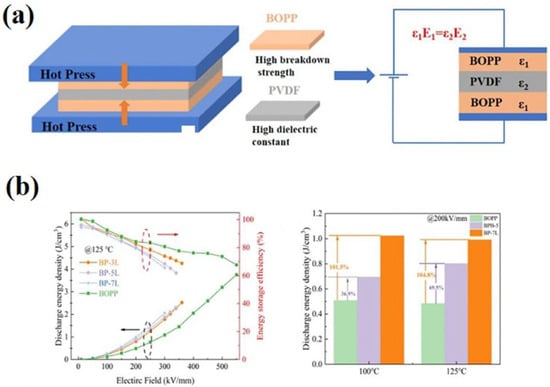 - Zhang, T.; Liang, S.; Yu, H.; Zhang, C.; Tang, C.; Li, H.; Chi, Q. Improved high-temperature energy storage density at low-electric field in BOPP/PVDF multilayer films. J. Appl. Polym. Sci. 2023, 140, e54729. [Google Scholar]