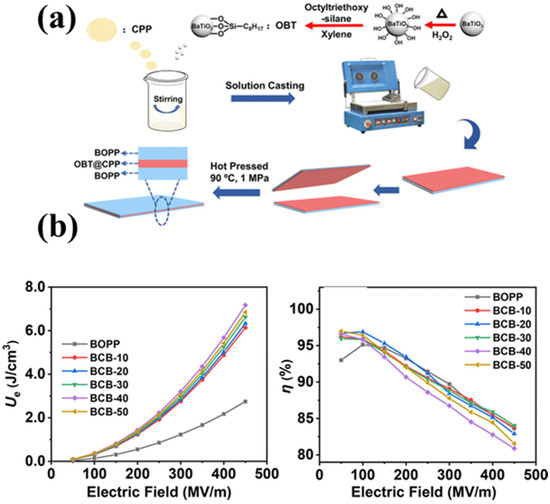 - Wu, Y.; Zhao, H.; Zhang, N.; Wang, H.; Zhang, C.; Yin, L.; Bai, J. Improved energy storage properties of polypropylene-based composite dielectrics by introducing surface-charged BaTiO3@chitisan ultrafine constructions. J. Mater. Chem. C 2024, 12, 2993–3004. [Google Scholar] [CrossRef]