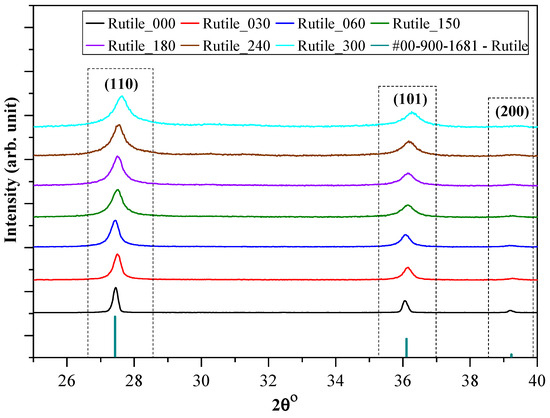 The XRD patterns of the rutile samples obtained after specific grinding times, showing the decrease in the primary crystallite size and pointing to the efficiency of the milling [53].