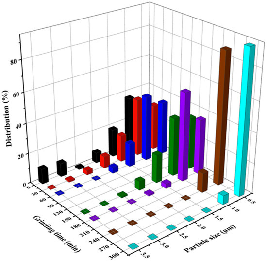 After 60 min of continuous sample processing, a large quantity of rutile particles was under 1 µm (80%); among them, the amount of ≤0.5 µm sized particles increased further (36%). After 150 min, the ratio of 0.5–1 µm sized particles was 59%, while the quantity of ≤0.5 µm sized crystals remained nearly unchanged. After 180 min, the amount of ≤0.5 µm sized particles increased further (to 41%), and the amount of 0.5–1 µm sized particles decreased (to 39%). Following 240 min of grinding, the size of all the particles was under 1 µm, while the ratio of ≤0.5 µm sized particles was 87%. After the longest grinding period (300 min), the quantity of ≤0.5 µm sized crystals was even higher, achieving 94% abundance. All the investigated size ranges reached a maximum at a certain optimal grinding time (Figure 3).