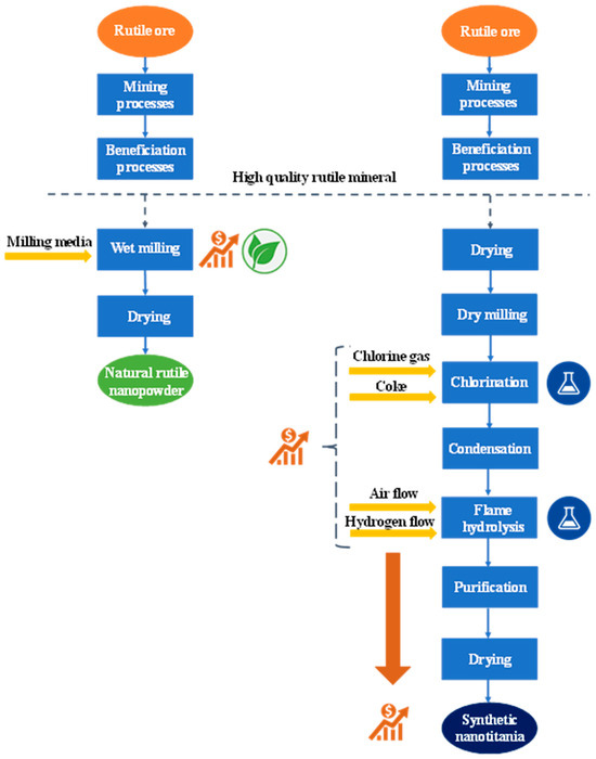 Figure 8 follows the steps of both processes, highlighting the resource and cost differences. The wet milling method chosen for the processing of natural rutile has a better grinding efficiency than dry milling, results in finer particles, has better heat dissipation, and it is also a greener method compared to any other chemical synthesis, but to achieve all this, it requires sophisticated equipment and can be an energy-intensive process [112].