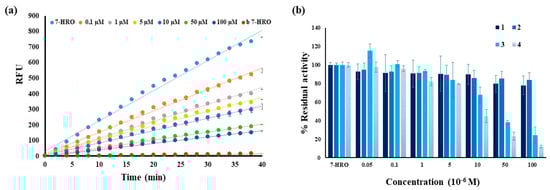 Fluorometric experiments results: (a) linear regression curves of kinetic experiment performed with compound 3 at different concentrations—b 7-HRO serves as the control for probe auto-hydrolysis; (b) residual activity percentage for compounds 1–4 at different concentrations (50 nM–100 µM).