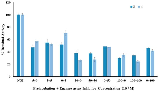 To evaluate the reversibility of inhibition, compounds 3 and 4 were incubated with hMAGL at three concentrations—low, medium, and high—to evaluate the reversibility at very low, medium, and high inhibitions of enzyme activity, followed by 15-fold dilution. Additional amounts of inhibitors were added and incubated for another 20 min before initiating the reaction with 7-HRO. The results showed no changes in residual activity after the second addition, indicating irreversible inhibition (Figure 4).
