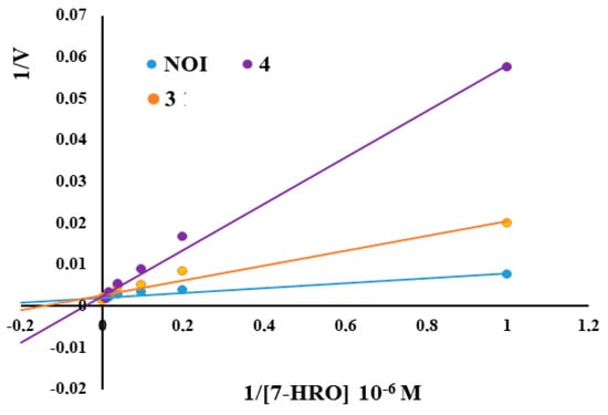 Finally, to better characterize the inhibition mechanism, fluorescence experiments were performed to determine the inhibition type: competitive, non-competitive, uncompetitive, or mixed. The effects of different concentrations of the substrate 7-HRO with hMAGL in the presence or absence of compounds 3 and 4 were analyzed. Michaelis–Menten curves gave Vmax and Km values and a Lineweaver–Burk plot was built reporting 1/V vs. 1/[7-HRO] (Figure 5). The obtained data (reported in Supplementary Materials, Table S1), with a not significant variation in Vmax and a 4- or 6-fold increase in Km, suggest a competitive inhibition for both molecules.