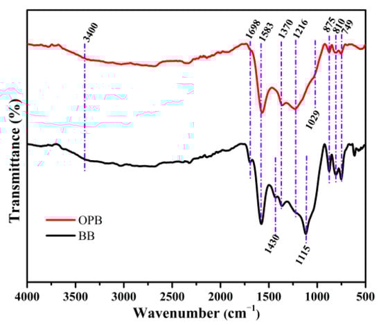 The FTIR spectra of BB and OPB are presented in Figure 2. It can be seen that except for three absorption peaks in FTIR, almost all the peaks are similar in both the synthesized biochars. The band at 3400 cm−1 indicates the O–H stretching vibration. The stretching vibration by the carbonyl groups of the carboxyl groups can be related to the peak at 1698 cm−1 [48,49]. Vibrational peaks at 1583 and 1115 cm−1 are ascribed to the C=O stretching vibration and C=O symmetrical stretching, respectively [50]. Aromatic C=C vibrations can also be attributed to the absorption peak at 1583 cm−1 [51]. The bending of C–H in aliphatic hydrocarbon has resulted in the FTIR peak at 1430 cm−1 [52]. The C–O stretching of carboxylic, ester, and ether groups in cellulose and hemicellulose is realized from the absorption peak at 1029 cm−1 [48,52]. The acidic functional groups from carboxylic and phenolic groups that have generated the peak at 1370 cm−1 as well as the presence of amine groups can be evidenced from the appearance of the absorption peak at 1216 cm−1 [53]. It is clearly evidenced that the presence of functional amine groups in OP biochar is much higher in comparison to BB. The absorption spectra attributed to the carbonates are found at 875 cm−1 [52]. The peak at 810 and 749 cm−1 in the FTIR spectrum of biochar is associated with C–H bending vibrations. This indicates the presence of aliphatic hydrocarbons in the biochar structure [50]. From the comparison of FTIR results, it is evident that OPB contains more carboxylic, ester, and ether groups. In addition, BB shows the presence of more aliphatic hydrocarbon at 1430 cm−1. Therefore, it can be concluded from the FTIR results that OPB contains more amine, carboxylic, ester, and ether groups.
