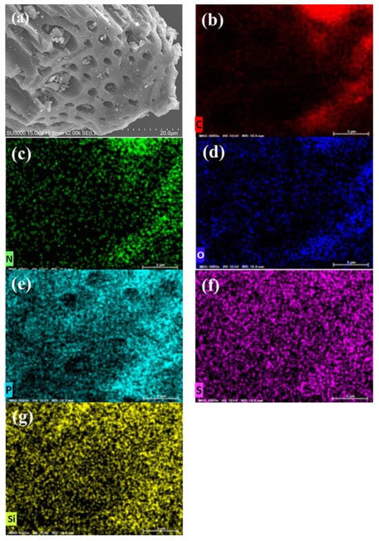 (a) SEM and (b–g) elemental distribution of C, N, O, P, S, and Si in BB sample by EDS mapping.