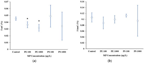 (a) Global DNA methylation and (b) global DNA hydroxymethylation in Daphnia magna exposed to PE and PS MPs at different concentrations (100 µg/L and 1000 µg/L). * Asterisks indicate significant difference from control group (p ≤ 0.05).