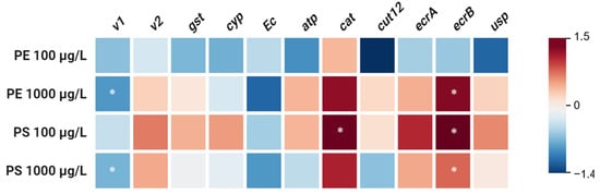 Relative changes in expression of target genes in response to PE and PS MPs exposure at different concentrations (100 µg/L and 1000 µg/L). Vitellogenin 1 (v1), vitellogenin 2 (v2), glutathione-s-transferase (gst), cytochrome P450 (cyp), ATPase Na+/K+ (atp), catalase (cat) cuticle protein 12 (cut12), ecdysone receptor b (ecr-b), and universal stress protein (usp). Asterisks indicate significant difference from control group (p ≤ 0.5).