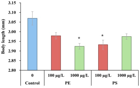Body length of Daphnia magna exposed to PE and PS microplastic particles at different concentrations (100 µg/L and 1000 µg/L) (n = 10). Asterisks indicate statistically significant differences compared to the control group (* p ≤ 0.5).