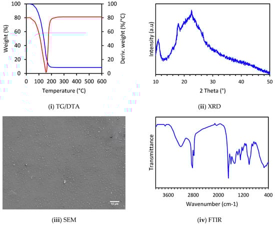 All thermal and structural analyses are displayed in Figure 4. TGA-DTA thermal analyses were used to study the thermal stability of the CB3C-5 biofilm. A slow mass loss was observed between 100 °C and 200 °C, probably due to the evaporation of moisture and organic compounds present in the biofilm [32]. X-ray diffraction (XRD) analysis showed an amorphous structure with characteristic weakly crystallized peaks at 11.1° and 18.2°, corresponding to the hydrated and anhydrous crystallization of chitosan, respectively, and a peak at 23.5° corresponding to the trispiral structure of collagen [33,34,35]. Scanning electron microscopy (SEM) analysis revealed a rough and regular surface of the biofilm, with dense grains and concavities. In addition, the presence of flocculation and aggregation in the biofilm fluids was observed, suggesting that some reaction products exist in the biofilm [36]. Fourier transform infrared spectroscopy (FTIR) results confirm the presence of chitosan, collagen, and Calothrixin A in the biofilm structure. Specific bands were observed for each component, confirming the SEM and XRD results: at 3450 cm−1 for chitosan, at 1650 cm−1 and 1550 cm−1 for collagen amides, and at 2850 cm−1 and 1700–1650 cm−1 for functional groups of Calothrixin A [37,38,39].