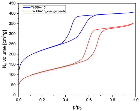 Nitrogen adsorption–desorption isotherms of the Ti-SBA-15 materials (standard Ti-SBA-15 and Ti-SBA-15_orange peels (material synthesized with the addition of ground orange peels)).