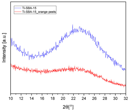 Both patterns exhibit broad diffraction peaks in the range of approximately 18–28° of 2θ angle, indicating the presence of TiO2. The intensity of the peaks for Ti-SBA-15 is significantly higher than for Ti-SBA-15_orange peels. This suggests that the standard material has a more well-defined or ordered structure compared to the material synthesized with orange peels. No sharp diffraction peaks corresponding to crystalline titanium oxide phases (e.g., anatase and rutile) are observed in either pattern. This suggests that titanium is well-dispersed in the silica matrix or exists in an amorphous state.