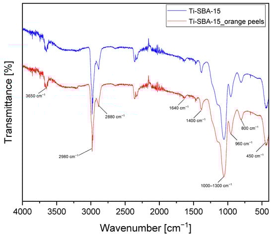 FTIR spectra of the Ti-SBA-15 materials (standard Ti-SBA-15 and Ti-SBA-15_orange peels (material synthesized with the addition of ground orange peels)).