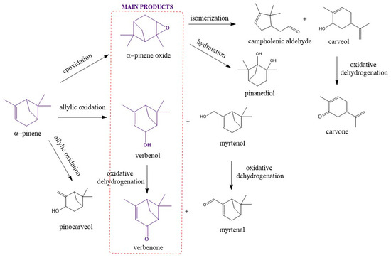 α-Pinene is one of the monoterpenes widely distributed in nature, belonging to the group of the most important constituents of the essential oils. Natural sources of this compound are coniferous trees, Juniperus species, citrus fruits, and other plants; it is also one of the main components of turpentine [20]. α-Pinene is characterized by the excellent safety profile and a wide range of pharmacological activities [21], including anti-cancer [22,23], anti-inflammatory [24], antimicrobial [25], anti-allergic [26], and others. Due to the wide availability and low price, α-pinene is also a valuable raw material for the synthesis of other useful compounds, characterized by its interesting biological activity or industrial utility. For this reason, extensive research is being conducted on various processes of its transformation towards other products, including isomerization and oxidation using heterogeneous catalysts. The structure of α-pinene contains a double bond, and therefore its oxidation reaction is easy to occur. Investigation of the thermal autoxidation mechanism of α-pinene showed the complexity of this radical process, which resulted not only in the formation of α-pinene oxide but also in a variety of other products, including hydroperoxides (pinocarvyl-hydroperoxide, pinenyl-hydroperoxide, myrtenyl-hydroperoxide, and verbenyl-hydroperoxide), alcohols (pinocarvol, pinenol, myrtenol, and verbenol), aldehydes (myrtenal), and ketones (pinocarvone and verbenone) [27,28].
