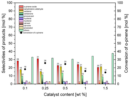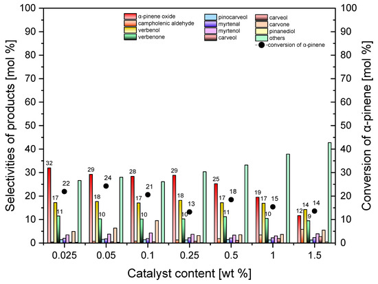 The studies of the influence of catalyst content (standard Ti-SBA-15) on the selectivities of transformation to appropriate products and on the conversion of α-pinene are presented in Figure 9.