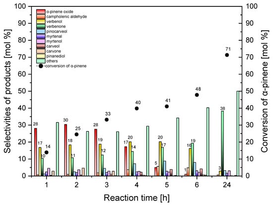Figure 10 shows that, with the prolongation in the reaction time 1 to 24 h, the selectivity of the transformation to the epoxy compound decreases from 28 mol% to 0 mol%; the highest value of this function of the process was obtained for the reaction time of 2 h, and it amounted to 30 mol%. The selectivity of transformation to verbenol remains at the level of 16–20 mol% during the reaction time in the range of 1–6 h, while for the reaction time of 24 h the selectivity of transformation to this compound amounts to only 3 mol%. As the reaction time increases from 1 to 24 h, the selectivity of transformation to verbenone increases from 10 mol% to 38 mol%. Particularly noteworthy is the very high selectivity of the transformation to this compound achieved for the reaction time of 24 h. With the increase in the reaction time, the conversion of α-pinene also increases from 14 mol% to 71 mol%. The reaction time of 3 h can be considered as the most favorable reaction time for oxidation which was performed with the standard SBA-15 catalyst, considering mainly the selectivities of the transformation to the three main products: alpha-pinene oxide (28 mol%), verbenol (19 mol%), verbenone (12 mol%), and in second place the conversion of α-pinene (33 mol%).