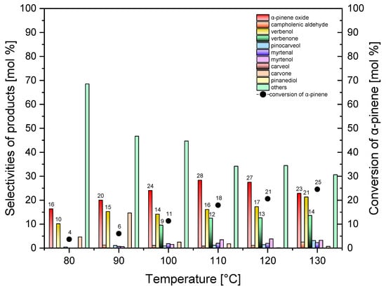 It results from Figure 8 that, with increases in the temperature values from 80 °C to 120 °C, the selectivity of the transformation to α-pinene oxide increases from 5 mol% to 25 mol% and then decreases to 19 mol% at the temperature of 130 °C. It is also visible that, with the increase in the temperature from 80 °C to 110 °C, the selectivity of the formation to verbenol increases from 7 mol% to 17 mol%, and the next remains at this level up to the temperature of 130 °C. The increase in the values of temperature from 80 °C to 90 °C also causes the increase in the values of the selectivity of the transformation to verbenone from 14 mol% to 18 mol%, and then this function decreases to 10 mol% (for the temperature of 130 °C). In the range of temperatures from 80 °C to 120 °C, the conversion of α-pinene increases from 3 mol% to 18 mol% and then slightly decreases to 13 mol% at the temperature of 130 °C. The analysis of the results presented in Figure 8 shows that the highest value of the selectivity of the main products (alpha-pinene oxide and verbenol) and the highest conversion of α-pinene were achieved when the reaction was carried out at 120 °C. Therefore, this temperature was considered as the most beneficial and selected for the next stages of the studies.