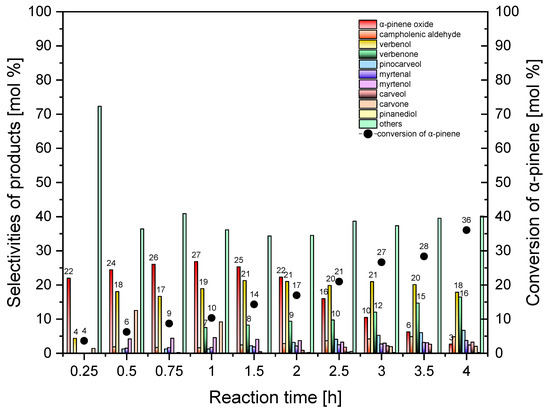 In the last stage of the catalytic studies, the aim was to investigate how reaction time affects the selectivity of the transformation to the appropriate products and the conversion of α-pinene in the presence of the mesoporous material, Ti-SBA-15_orange peel, as the catalyst. The oxidation of α-pinene was conducted in the range of reaction times from 0.25 to 4 h at the temperature of 130 °C, with the catalyst content amounting to 0.25 wt%. The obtained results are presented in Figure 13.