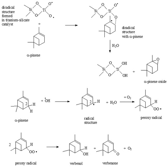Figure 15 shows a probable way of α-pinene oxide formation, during which a diradical structure is formed. It is formed as a result of an interaction of the diradical structure, produced in the titanium silicate catalyst, with the participation of the active center in the form of Ti tetrahedrally bonded in the silica structure, with the α-pinene molecule. Later, hydrolysis of this diradical structure takes place, and α-pinene oxide is formed, and two hydroxyl groups are recreated at the Ti atom. In the formation of verbenol and verbenone hydroxyl radicals play a key role (Figure 15). These radicals interact with the a-pinene molecule, as a result of which the H atom located in position 2 in the α-pinene molecule is removed. As a result of the removal of a proton, a radical structure is formed, and a water molecule is formed. This radical structure then reacts with the oxygen molecule, as a result of which a peroxy radical is formed. In the next step, a verbenol and verbenone molecule is formed from two peroxiradicals.