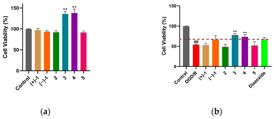 Cell viability assays: (a) The toxicity of compounds (±)-1–5 to cardiomyocytes at 10 μM; (b) the protective effects of compounds (±)-1–5 on OGD/R-induced cardiomyocytes at 10 μM. Values are expressed as the mean ± SD, n = 3. ** p < 0.01 vs. control group in (a) and vs. OGD/R group in (b). ## p < 0.01 vs. control group.