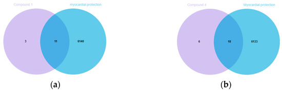 Venn diagrams: (a) potential targets of (−)-1 intersected with myocardial protection-related targets; (b) potential targets of 4 intersected with myocardial protection-related targets.