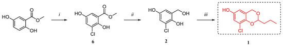 Furthermore, we speculated as its biosynthetic pathway that it may be obtained from 3-chlorogentisyl alcohol (2, also obtained from the same strain) and a molecule of n-butyraldehyde through acetal formation (Figure 4). Meanwhile, we found that most of the benzo-1,3-dioxane structures were obtained by chemical synthesis, especially those containing halogens.