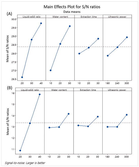 In the main effect plot for the S/N ratios, the mean S/N ratios for each factor were plotted against the test levels for each factor parameter (Figure 1). The main effects plot of TSC indicates that the liquid–solid ratio had the largest influence, followed by the water content, while the extraction time and ultrasonic power had very slight impacts (Figure 1A). Similarly, the TPC was greatly influenced by the liquid–solid ratio, with the effects of the other parameters being very slight (Figure 1B).