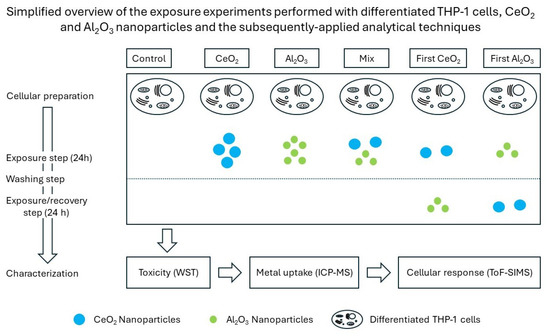 Ceriumdioxide NPs are emitted in the exhaust gases of cars [24]. Studies on NPs have reported different effects in cell culture experiments, such as increases in oxidative stress and apoptosis, as well as a protective influence, attributed to their antioxidant properties [25,26,27]. These results make NPs a worthwhile candidate for studying the different connections between NPs and cellular responses [28]. Aluminum is a naturally occurring and ubiquitous element [29,30]. Due to its chemical nature, it is mainly present as aluminum, aluminum oxide, or aluminum hydroxide. Aluminum oxide is used during the manufacturing process of a wide range of everyday products, such as ceramics, electrical insulators, paper, light bulbs, and concrete. It is also used as a food additive [31,32,33]. Several forms of aluminum oxide exist, with the alpha and gamma forms being the major ones. Due to its oxidized surface, the solubility of gamma aluminum oxide is expected to be low. However, depending on the pH, dissolution may occur. Therefore, instead of dissolution outside the cells, ionic aluminum can have cytotoxic effects after uptake and lysosomal digestion. Research suggests that different aluminum species pose health risks [34]. Due to their potential for interaction with NPs after uptake, gamma- NPs were selected as the second exposure material in our experiments. The joint research centre (JRC) repository material NM-212 and NMs from Iolitec were selected for and , respectively [35,36,37]. We selected this NM combination for several reasons. As both NMs are used in a wide range of applications, such exposure scenarios are likely to occur in real life [38,39]. Additionally, based on the available research, potential adverse biological and mitigating effects have been reported, indicating this would be an exemplary co-exposure scenario for use in this proof-of-principle study [40,41,42]. Furthermore, both materials have been well described in past work and can be obtained commercially [35,36,37,43,44]. An overview of the key characterization parameters is provided in Table S1. Differentiated THP-1 cells, which have been shown to express macrophage-like behavior, were chosen as a cell culture model [45,46]. An advantage of this model is its potential for investigating effects in the context of different kinds of (co-)exposure scenarios, including potential NP–NP interactions and their effect on cellular responses due to the expected accumulation of NPs.
