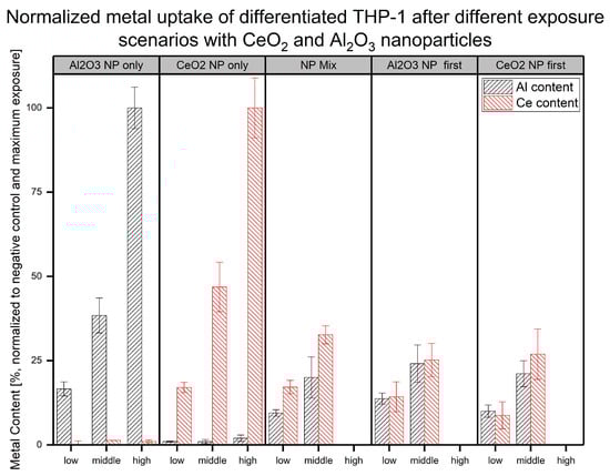 To determine the reason for the differences observed in the cell viability changes in the differentiated THP-1 cells after their exposure to NPs, the NP uptake according to the metallic content of the digested cells was determined. The exposed cells were digested, and the total metallic content was quantified. To further highlight changes, different exposure scenarios were used over a timeframe of 48 h. In addition to the single-exposure experiments, a stepwise exposure plan was followed. Here, the NP-containing cell culture media was changed after 24 h to the medium containing the other NPs. A more detailed overview of the experimental design can be found in Figure 1. Based on the unexposed control and the highest NP concentration used, a normalized overview of the amount of metals after cellular exposure is shown in Figure 3.