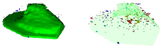 Representative ToF-SIMS 3D reconstruction of a single differentiated THP-1 cell exposed to a mix of (blue) and (red) NPs with a non-transparent (left-hand side) and a transparent (right-hand side) visualization of the signals related to the cell membrane (green). The lateral resolution obtained was roughly 80 nm, leading to a cell size of 17.2 µm and 8.6 µm.