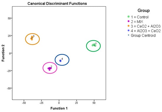 ToF-SIMS analysis of changes in the metabolited (lipids) of THP-1 cells after time-dependent treatment with and . The diagram shows the values of the scores obtained from Fisher’s discriminant analysis of 6 THP−1 samples for each experiment. Group 1 shows the untreated cells (control, green). Group 2 was exposed to both particles together from time point 0 (mix, purple). Group 3 was exposed to nanoparticles at time point 0 and to nanoparticles at 24 h ( + , orange). Group 4 was exposed to nanoparticles at time point 0 and to nanoparticles at 24 h ( + , blue). Factor 1 in the principal component analysis accounted for 72.9% of the observed variance in the model, and factor 2 in the principal component analysis (PCA) accounted for 20.7% of the variance in the model.