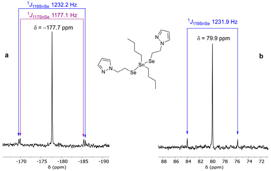 The 119Sn{1H} spectra of all compounds bearing the organoselenolato ligand show a singlet resonance in each case, accompanied by 1JSeSn coupling constants. The 119Sn{1H} resonance of compound 9 has a different pattern (see the Supplementary Information, Figure S7), the splitting suggesting dipolar interactions with the two quadrupolar 14N nuclei and 119Sn-14N spin–spin coupling, as previously described by Wrackmeyer [49]. The 77Se{1H} spectra show a singlet resonance for each compound, accompanied by 1J117SnSe and 1J119SnSe coupling constants. The values for the 1JSeSn coupling constants, along with the 119Sn and the 77Se chemical shifts for compounds 1–10, and the starting diorganotin halides, are given in Table 2, while the 119Sn{1H} and the 77Se{1H} resonances for compound 2, as an example, are displayed in Figure 1. Based on the NMR spectra, we can conclude that in each case, the organoselenolato ligand is attached to tin by selenium.