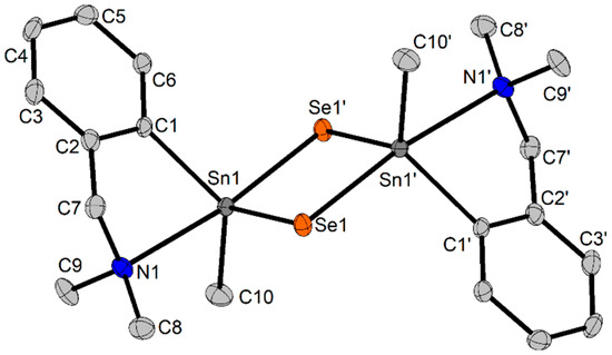 Our attempts to grow single-crystals of compound 4 from a mixture of CH2Cl2 and n-hexane resulted in a decomposition solid product with a dimeric structure, namely {[2-(Me2NCH2)C6H4](Me)SnSe}2 (4-a). Compound 5, which was isolated as an oil, decomposed in CDCl3 solution in a similar way, and we observed the formation of a solid microcrystalline product in the NMR tube after several days. The X-ray diffraction studies also revealed for this compound the formation of the dimeric species {[2-(Me2NCH2)C6H4](nBu)SnSe}2 (5-a). We have to mention that it was previously reported that in CHCl3 or CH2Cl2 solutions, the tin(IV) complex [Sn(S2CNEt2)4] decomposed with the formation of the dimeric [SnS(S2CNEt2)2]2 with a planar Sn2S2 core, and S(S2CNEt2)2 [57], in a way similar to what we found for compounds 4 and 5. The dimeric structure of compound 4-a is depicted in Figure 2, while that of 5-a is given in the Supplementary Information, Figure S9. Important interatomic distances and bond angles are given in Table 3.