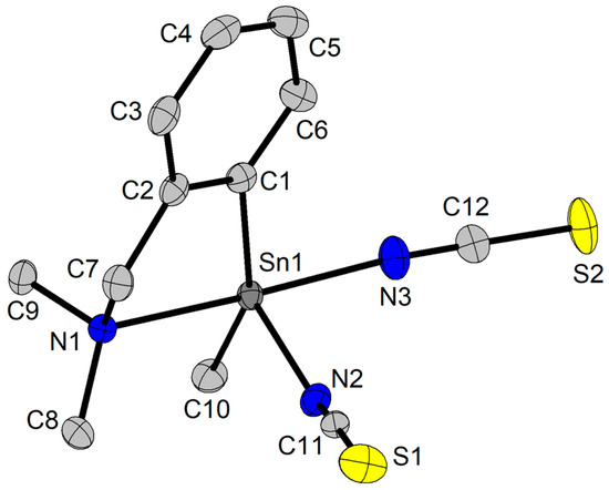 In the case of compound 9, the CH2N(CH3)2 protons give very broad 1H NMR resonances at room temperature, thus suggesting a dynamic behaviour in solution, as described above, but slower at room temperature than observed in compounds 4–6. To further investigate this behaviour, we performed low temperature 1H NMR experiments (see the Supplementary Information, Figure S8), and we could observe that at low temperatures, the CH2N protons and the two N(CH3)2 groups, respectively, are no more equivalent (at −30 °C δ(1H)Me 2.24 and 2.46 ppm, and δA(1H)CH2 3.47 and δB(1H)CH2 3.94 ppm). We could calculate the free enthalpy, ΔG# = 58.7 KJ/mol, at the coalescence temperature Tc = 15 °C, for the dynamic process suffered by the CH2 protons in the CH2N(CH3)2 pendant arm, and a ΔG# = 70.8 KJ/mol at Tc = 10 °C for the two methyl groups. We can conclude that for compound 9, the variable-temperature 1H NMR spectra proved that under 0 °C, the nitrogen atom in the CH2N(CH3)2 pendant arm remains coordinated with tin, while above this temperature the compound undergoes a dynamic process. In this way, we assume that at low temperatures compound 9 has the same molecular structure as that one determined in solid state by single-crystal X-ray diffraction, as discussed below. For compound 8, we can assume a similar behaviour, where the N→Sn coordination involving the nitrogen atom in the pendant arm is present at low temperatures as well, while at room temperature the compound exhibits fluxionality in solution, and we expect for this compound, at low temperatures, a similar structure with that determined by single-crystal X-ray diffraction. Moreover, the chemical shift values of the 119Sn resonances for these two compounds suggest the existence of intramolecularly coordinated pendant arms, which results in five-coordinate tin atoms [56]. The 119Sn chemical shift for 8 at −252.7 ppm is close to those observed previously for the related [2-(Me2NCH2)C6H4](nBu)Sn(NCS)2 (−266.6 ppm) and [2-(Me2NCH2)C6H4](Ph)Sn(NCS)2 (−329.3 ppm) [44], while for 9 the 119Sn resonance was observed at −161.8 ppm. These values are consistent with pentacoordinate Sn compounds [56], similarly to their solid state structure.