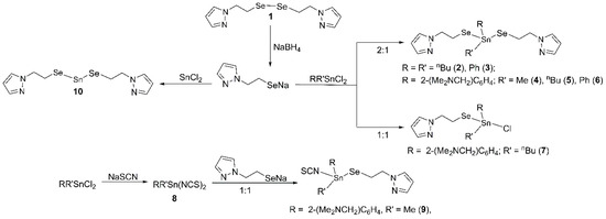 Previously, we reported on the tin complexes Sn[SeC6H4(CH2NMe2)-2][N(SiMe3)2] and Sn(SePh)2[N(SiMe3)2] [43], obtained by the reactions of Sn[N(SiMe3)2]2 with the corresponding diorganodiselenide, as well as homo- and heteroleptic di- and triorganotin(IV) complexes with pseudohalido ligands, i.e., [2-(Me2NCH2)C6H4]RSn(NCE)2 [E = S, Se; R = nBu, Ph, 2-(Me2NCH2)C6H4] and [2-(Me2NCH2)C6H4]R2Sn(NCE) (E = S, Se, R = Me, Ph) [44], or dithiocarbamato ligands, i.e., RR′Sn(S2CNR″2)Cl [R = R′ = Me, nBu; R″ = Me, Et; R = 2-(Me2NCH2)C6H4, R′ = Me, R″ = Me, Et] and RR′Sn(S2CNR″2)(NCS) [R = R′ = Me, nBu, R″ = Me, Et; R = 2-(Me2NCH2)C6H4, R′ = Me, nBu, R″ = Me, Et [45], prepared by salt metathesis reactions. Recently, we reported on diorganotin(IV) compounds with organoselenolato ligands bearing alkyl groups with pyrazole moieties, namely R2Sn(SeCH2CH2pz)2 [R = Me, 2-(Me2NCH2)C6H4], and we investigated their antiproliferative activity against murine colon carcinoma C26 cells [46]. As a continuation of our research on this topic, the present work reports on the synthesis and structural characterization of new homo- and heteroleptic diorganotin(IV) bis(organoselenolates) with pyrazole containing organic groups, namely RR′Sn(SeCH2CH2pz)2 [R = R′ = nBu (2), Ph (3); R = 2-(Me2NCH2)C6H4, R′ = Me (4), nBu (5), Ph (6)], [2-(Me2NCH2)C6H4](nBu)SnCl(CH2CH2Se) (7), [2-(Me2NCH2)C6H4](Me)Sn(NCS)2 (8), and [2-(Me2NCH2)C6H4](Me)Sn(NCS)(SeCH2CH2pz) (9), as well as the tin(II) complex Sn(SeCH2CH2pz)2 (10).