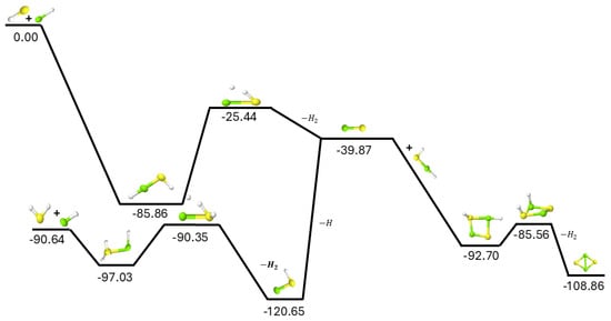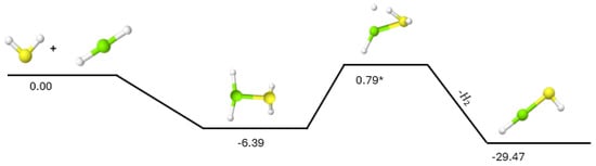 Similarly, the addition of H2S to magnesium dihydride (MgH2), as shown in Figure 2, is able to form HMgSH with another small energy barrier of 0.79 kcal mol−1 for the hydrogen ejection, equivalent to an external temperature of 388 K or requiring only about 90 K for 1% of the population to overcome this TS. Unfortunately, starting the reaction from H2S + MgH2 and producing HMgSH 29.47 kcal mol−1 below the reactants implies that the second H2 production TS is more than 30 kcal mol−1 above the starting materials. The pathway from HMgSH to MgS has already been shown in Figure 1 to require a total TS barrier for the second H2 production at roughly 60 kcal mol−1 relative to HMgSH. As such, the reaction of H2S + MgH2 will likely only produce HMgSH similar to what has been shown for H2S + SiH2 [24]. The lack of evidence for MgH2 in astronomical regions may imply that this reaction is likely not a notable contributor to the overall magnesium reaction network. If HMgSH can be produced, however, from either H2S + MgH2 or as the initial intermediate in SH + MgH, it actually can take part in some additional, useful chemistry.