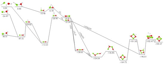Reaction profile for the formation of MgO dimer. Relative energies are expressed in kcal mol−1. Red is oxygen, white is hydrogen, and green is magnesium. Reactants in their excited state are depicted with an asterisk (*).