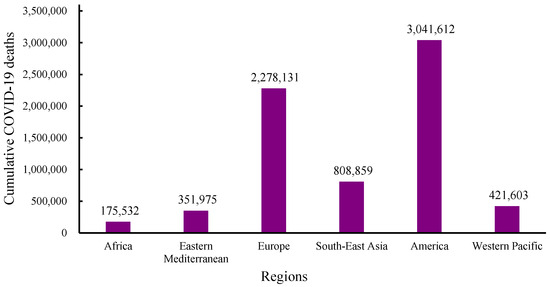 Despite efforts made in viral prevention and control, the emergence of the COVID-19 pandemic brought emotional, health, and economic shocks to the lives of many. The WHO dashboard reported that from December 2019 to 1 December 2024, total COVID-19 infections numbered 776,973,432 globally, with 7,077,725 deaths (Figure 1 and Figure 2) [46]. In December 2024, there were more than 47,230 cases globally and 521 deaths from COVID-19 within the previous 7 days. Europe had the highest cumulative infection rates, with 0.326 from 2019 to 2023 and 0.377 from 2019 to 2024 [46,47,48]. In contrast, Africa had the lowest rates, with 0.011 from 2019 to 2023 and 0.006 from 2019 to 2024 [46,47,49]. Furthermore, high- and middle-income countries experienced higher infection rates compared with low-income countries [46,47].