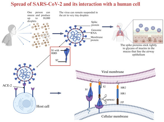Diagram of how SARS-CoV-2 is spread and how it interacts with the host cell. Created in BioRender. Collier, W. (2025) https://BioRender.com/t31u631 (accessed 21 March 2025).