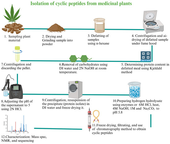Antiviral drug development has long been neglected compared with vaccine development. During the COVID-19 pandemic, repurposed drugs were used extensively to fill the gap. Thus, effective and safe antiviral drugs to efficiently treat future viral threats need to be developed. Phytocompounds can contribute to the development of new antiviral drugs as they are a huge source of bioactive compounds including antivirals. Phytochemicals with antiviral activities include peptides (both linear and cyclic) and other compounds. Peptides have been found to influence membrane permeability, viral replication, and cellular functions. Therefore, they are attractive targets for antiviral research and development [37]. Specifically, cyclic peptides have attracted attention as antiviral candidates due to their stability, enzymatic hydrolysis resistance, and selectivity to receptors [38,39]. These peptides have demonstrated therapeutic potential in treating cancer and various diseases, including resistant and non-resistant bacterial, viral, and fungal infections [40]. Linear peptides are susceptible to peptidase enzyme degradation, pose off-target effects, and require routine dosing; thus, they are unstable and ineffective [41]. Furthermore, cyclic peptides offer low toxicity [40,42,43], compared with other antiviral compounds that target RNA viruses, along with high effectiveness, but they pose serious risks. The growing interest in both natural and synthetic (designed) cyclic peptide drugs can be attributed to their diverse chemical structures and biological activities, improvements in methods for their synthesis, and increased understanding of protein–protein interactions [44,45].