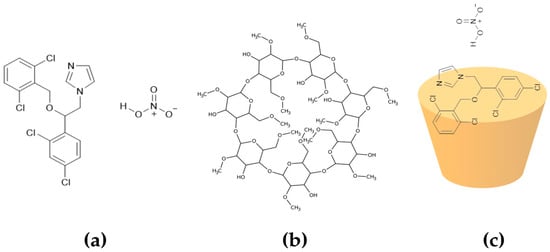 Chemical structures of (a) isoconazole nitrate and (b) methyl-β-cyclodextrin and (c) the schematic representation of the inclusion complex formation mechanism (ISN/M-β-CD).
