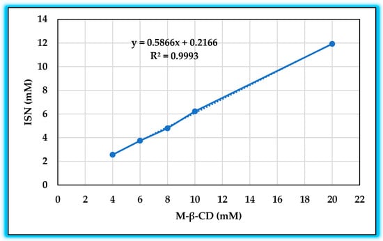 To determine the molar ratio between ISN and M-β-CD, a phase solubility study was conducted using M-β-CD solutions (20 mM) with an excess amount of ISN. The system was allowed to reach equilibrium over three days, with 24 h confirmed as the equilibrium time for M-β-CD solutions. The phase solubility diagram (Figure 2) was obtained by plotting the solubilized ISN concentration against the M-β-CD concentration, confirming that the system followed an AL-type solubility profile, which is indicative of 1:1 complexation []. The slope of the solubility curve (0.5866) remained below 1, further verifying the 1:1 host–guest inclusion complex formation [].