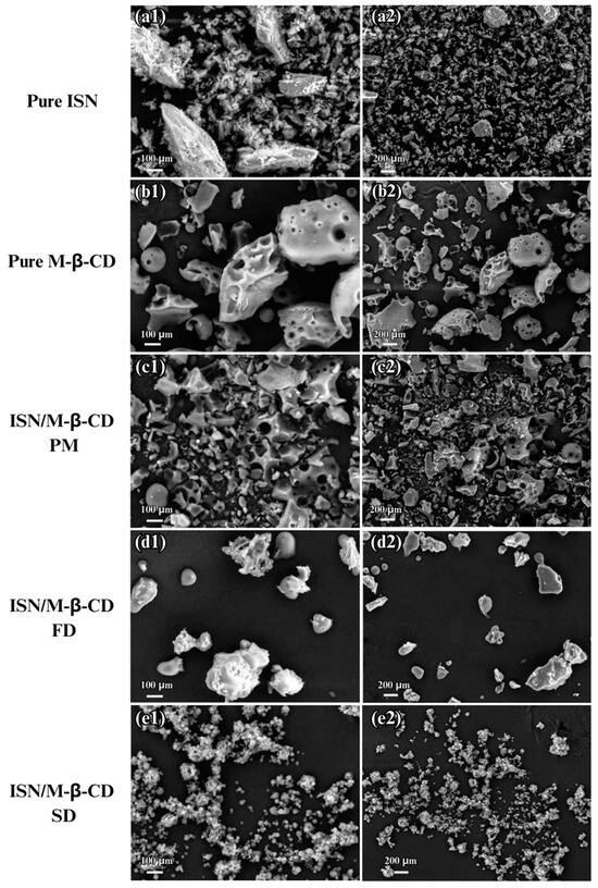 SEM images of ISN (a1,a2), M-β-CD (b1,b2), ISN/M-β-CD physical mixture (c1,c2), ISN/M-β-CD freeze-dried inclusion complex (d1,d2), and ISN/M-β-CD spray-dried inclusion complex (e1,e2).